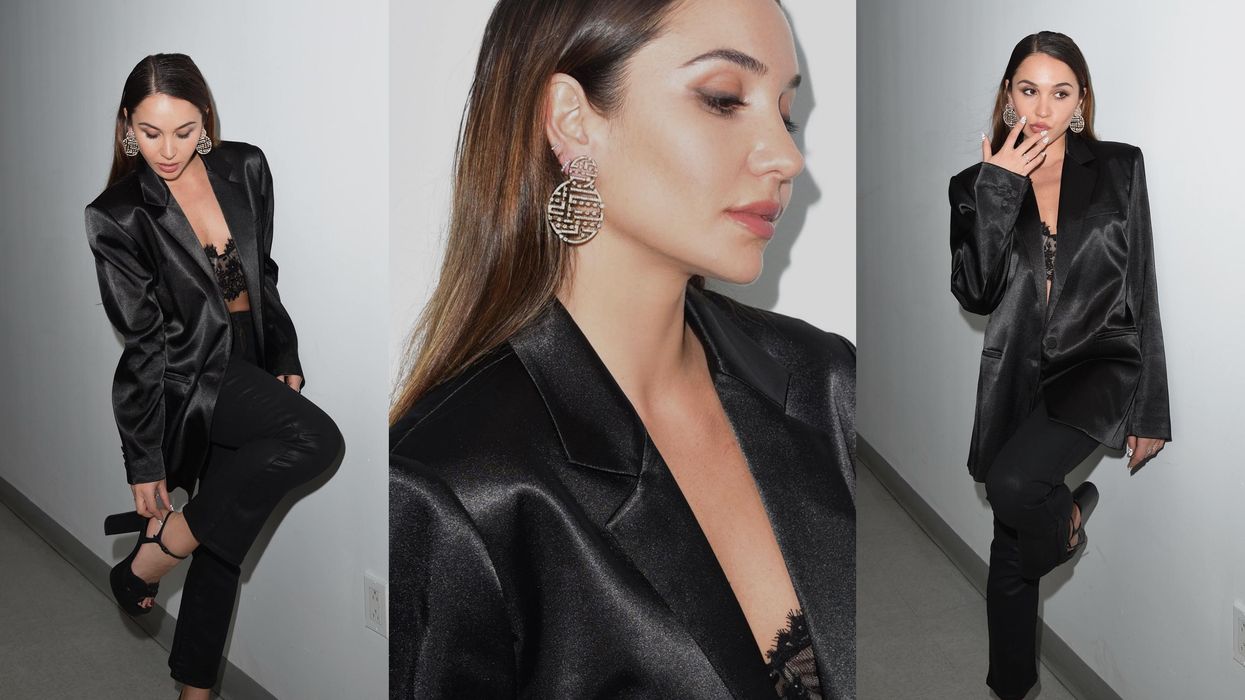 “This is an example of how a statement piece can really dress up a look, especially in winter while going out. This outfit is my go-to when I have a date or dinner and I don't know what to wear. I always do an oversized blazer, tight black pants, and heels. Different jewelry really changes the look. It's a great holiday look, while still being a bit edgy and not too on the nose with styling.”